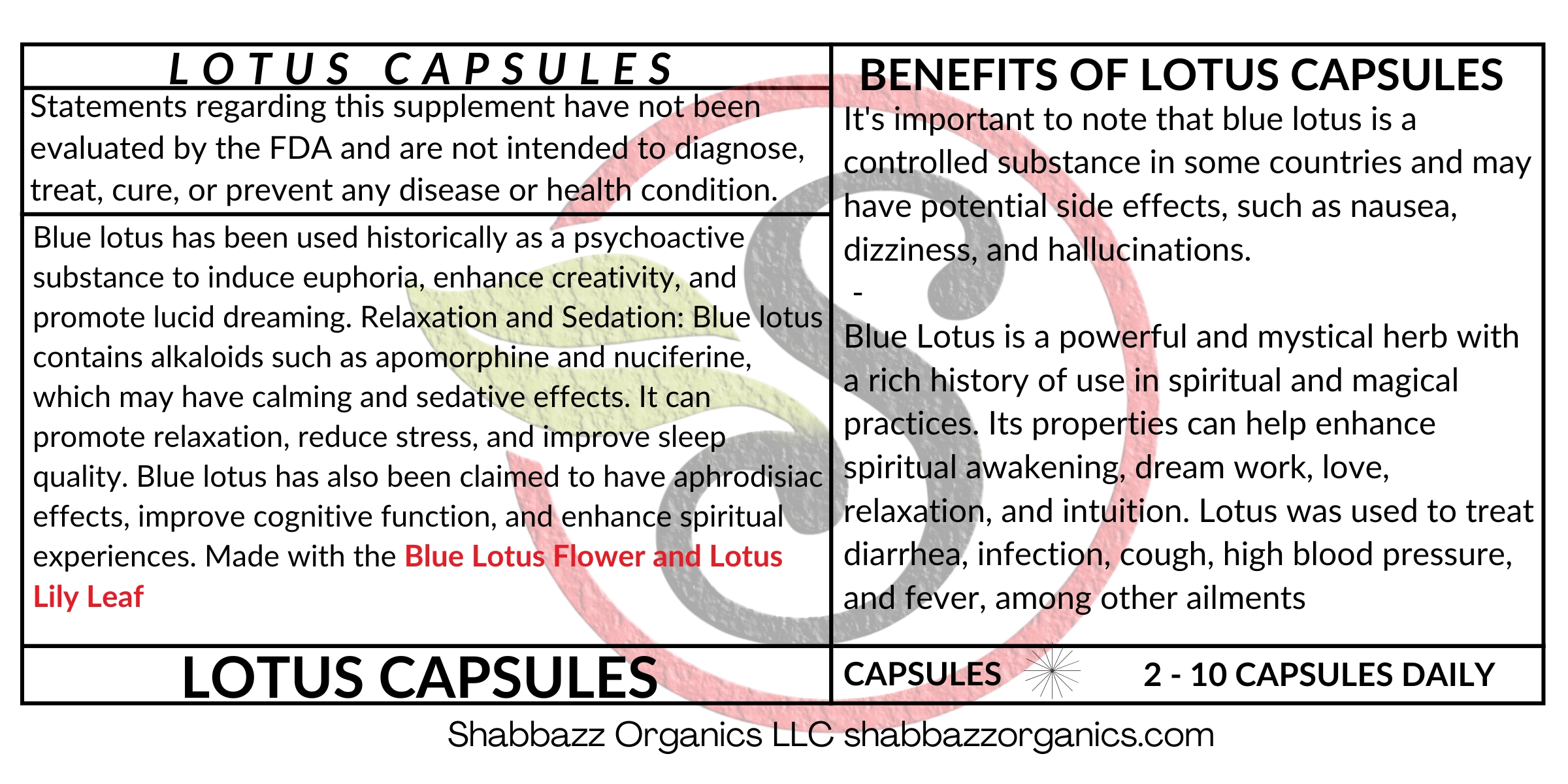 Blue Lotus is a powerful and mystical herb with a rich history of use in spiritual and magical practices. Its properties can help enhance spiritual awakening, dream work, love, relaxation, and intuition. Lotus was used to treat diarrhea, infection, cough, high blood pressure, and fever, among other ailments